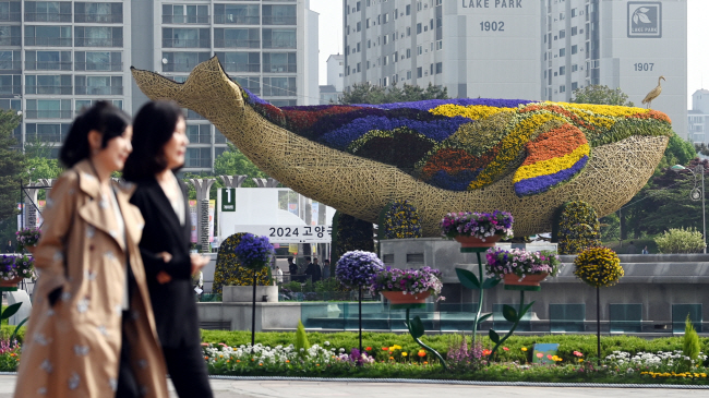 고양국제꽃박람회 개막일인 26일 오전 경기 고양시 일산호수공원에 높이 10m, 길이 20m인 초대형 꽃 등고래 조형물이 설치돼 있다.