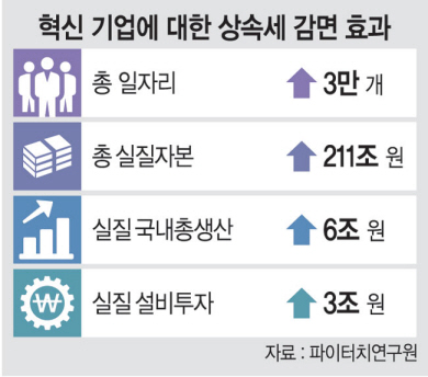 1일 파이터치연구원이 혁신기업의 상속세 감면 효과를 분석한 보고서에 따르면 가업 상속세율 100% 감면 시 실질 GDP 6조 원, 일자리 3만 개, 총 실질자본 211조 원, 실질 설비투자 3조 원씩 증가한다. 노벨경제학상을 받은 로버트 루커스 시카고대 명예교수의 모형을 기반으로 도출한 결과다. 혁신기업은 경상연구개발비 5년 평균값이 해당 업종의 5년 평균값을 초과하는 기업을 뜻한다. 혁신기업이 상속세를 감면받으면 자본을 후대에 물려줌으로써 얻는 ‘한계효용’(만족감)이 증가하기 때문에 자본 확충을 더 늘리게 된다고 보고서는 설명했다. 노동 수요량, 재화 생산량, 이윤도 늘어 전체적인 혁신기업 수 역시 증가하는 선순환 구조가 형성될 것이라고 전망했다.