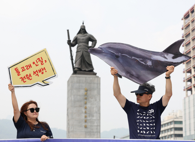 환경운동연합 바다위원회 회원들이 지난 4월 30일 서울 종로구 광화문광장에서 열린 ‘돌핀쇼 중단하고 바다로 돌려보내라’ 캠페인에서 수족관 돌고래를 바다로 돌려보내 줄 것을 촉구하고 있다.