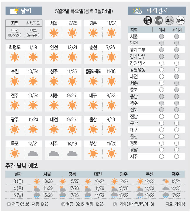 [날씨이야기] 5월2일 목요일(음력 3월24일)