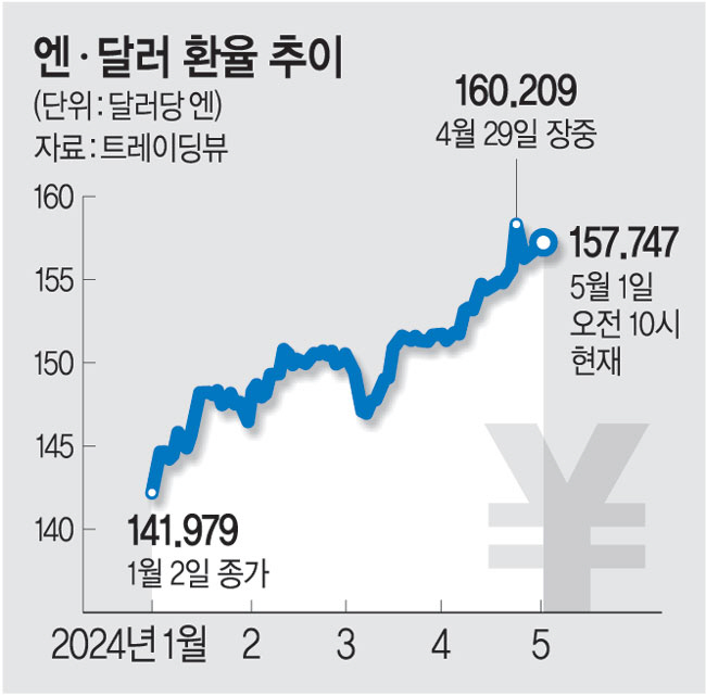엔·달러 환율은 지난달 29일 해외 외환시장에서 장중 한때 160엔을 돌파했다가 곧바로 150엔대로 떨어졌다. 1990년 4월 이후 34년 만에 기록한 것인데 시장에서는 일본 외환 당국이 시장에 개입했을 것으로 보고 있다. 시장에서는 일본 외환 당국이 개입 사실을 공표하지 않고 몰래 개입하는 것을 의미하는 ‘복면 개입’을 했을 것으로 분석하고 있다.