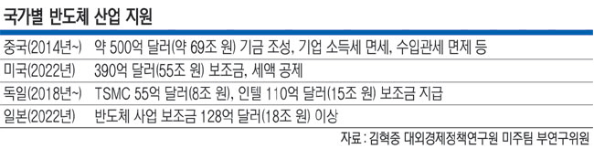 김혁중 대외경제정책연구원(KIEP) 세계지역연구센터 미주팀 부연구위원은 지난달 30일 서울 중구 대한상공회의소에서 니어재단 주최로 열린 ‘세계 반도체 전쟁, 한국은 승자의 반열에 오를 수 있을 것인가’ 포럼에서 중국, 미국, 일본, 인도 등을 비롯한 주요국의 최근 반도체 직접 지원금 규모가 1446억3000만 달러에 달한다고 밝혔다. 이 가운데 가장 지원 규모가 큰 국가는 중국으로, 2014년부터 조성한 국가 반도체 산업 투자기금 1~2기 규모는 약 500억 달러(약 69조 원)라고 김 위원은 제시했다. 2022년 ‘반도체와 과학법’을 통과시킨 미국(390억 달러(55조 원) 보조금 및 세액 공제 등)은 2위에 올랐다. 일본이 128억 달러(18조 원) 이상, 인도는 100억 달러(14조 원)로 뒤를 이었다. 김 위원은 “중국이 반도체 산업 대기금을 조성하면서 장작을 쌓고 미국이 여기에 불을 지폈다고 볼 수 있다”며 “총칼이 오가는 이스라엘도 인텔에 대해 32조 원 규모의 보조금을 편성하고 있다는 점을 주목해야 한다”고 강조했다.