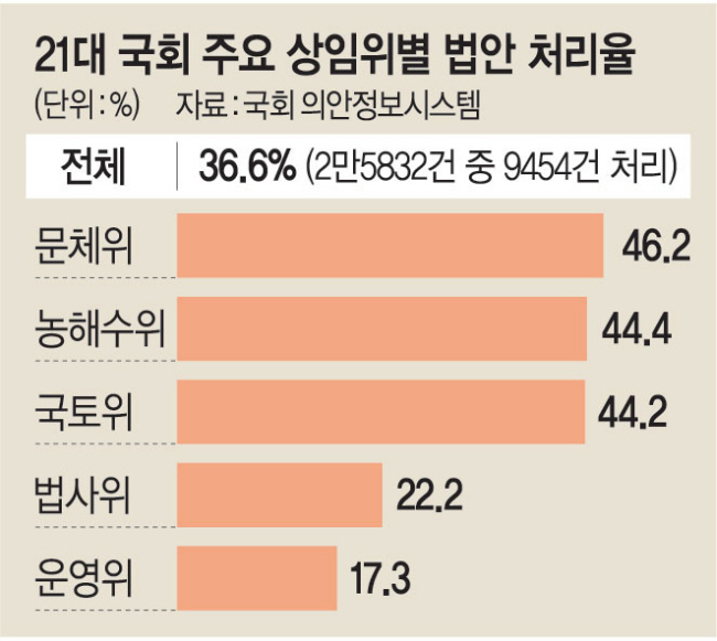 문화일보가 10일 21대 국회의 17개 상임위별 법안 처리 결과를 분석한 결과, 운영위와 법사위는 처리율이 각각 17.3%, 22.2%에 그쳤다. 대통령실 현안을 포함해 국회법 및 국회 운영 사항 등을 다루는 운영위의 법안 접수 건수가 479건에 불과하다는 점을 고려하면, 각 상임위를 통과한 법안들이 모이는 법사위가 사실상 ‘꼴찌’를 기록한 셈이다.
