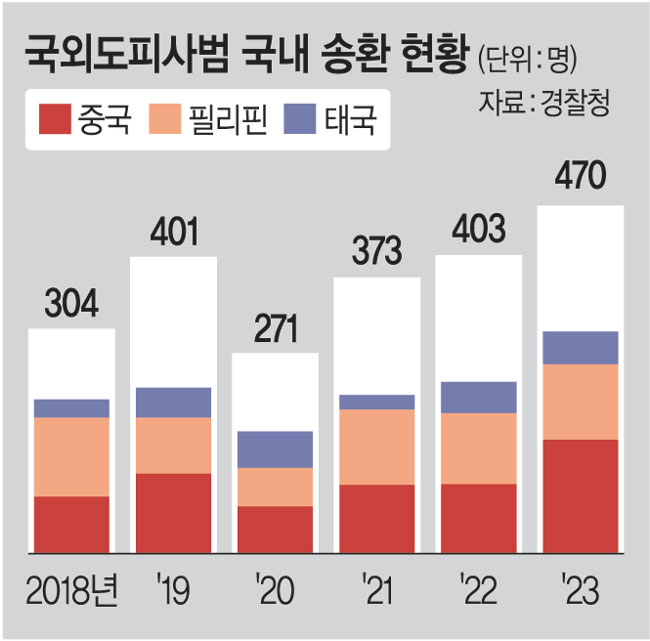 그러나 이 같은 수치는 무려 953명을 기록한 2021년에 비하면 절반 가까이 줄어든 규모다. 2018년 579명이었던 국외도피 사범은 2019년 927명으로 껑충 뛰었고, 2021년까지 900명대를 유지했다. 그러다가 2022년 549명으로 다시 뚝 떨어졌고, 지난해엔 그 숫자가 더 줄었다. 이런 변화는 국제공조 강화로 국외도피 사범의 송환이 늘어나는 추세와 무관하지 않은 것으로 보인다. 해외로 도망쳐 숨어도 다시 잡혀 올 가능성이 커졌기 때문이다. 2020년 271명에 그쳤던 송환자 수는 2021년(373명), 2022년(403명)에 이어 지난해 470명으로 지속 증가했다. 2020년과 비교하면 무려 73% 늘어난 숫자다. 현재 해외 도피 범죄자의 평균 도피 기간은 3년 반 정도인데, 이 같은 추세가 지속한다면 더 단축될 수 있다는 전망이 나온다.