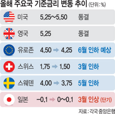 ECB도 지난달 통화정책이사회에서부터 ‘6월 인하’ 신호를 내기 시작했다. 크리스틴 라가르드 ECB 총재가 공식 정책발표에서 금리 인하를 언급했기 때문이다. 이미 유럽 일부 국가에서는 금리 인하 행렬이 시작됐다. 스위스 중앙은행이 지난 3월 기준금리를 1.75%에서 1.50%로 낮춘 데 이어, 스웨덴 중앙은행도 지난 8일 기준금리를 4.00%에서 3.75%로 0.25%포인트 내렸다.