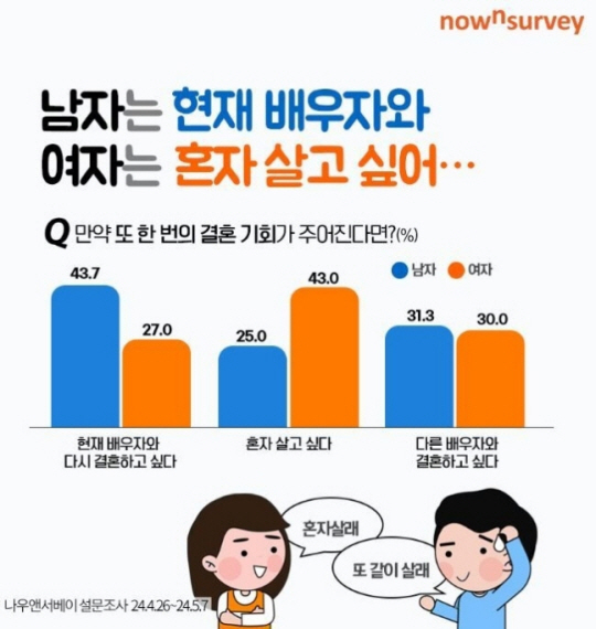 21일 나우앤서베이가 발표한 ‘한국 기혼 남녀 결혼 생활 만족도 설문조사’에서 ‘현재 배우자와 다시 결혼할 것인지’ 묻는 질문에 응답자의 37%가 ‘현재 배우자와 다시 결혼하겠다’고 답했다. ‘현재 배우자와 다시 결혼하겠다’고 답한 남성은 43.7%인 반면, 여성은 같은 대답에 27%만 긍정적으로 답했다.