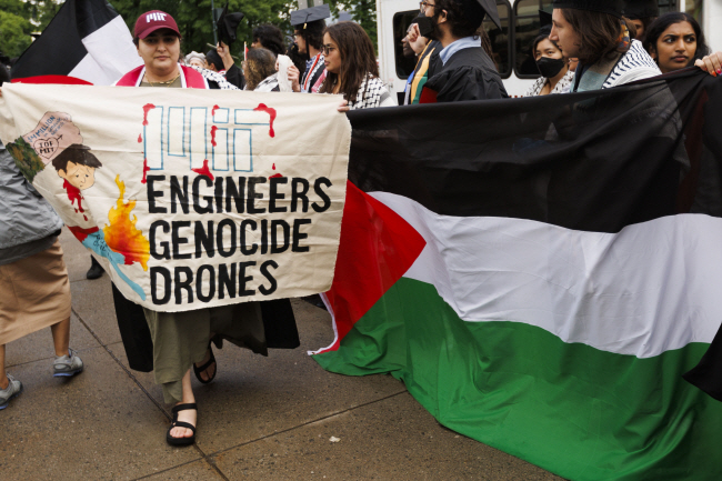 30일 열린 미국 매사추세츠공대(MIT) 졸업식에서 팔레스타인을 지지하는 학생 시위대가 대형 팔레스타인 국기와 함께 MIT와 이스라엘군 간 재정적 관계를 비판하는 플래카드를 들고 행진하고 있다.