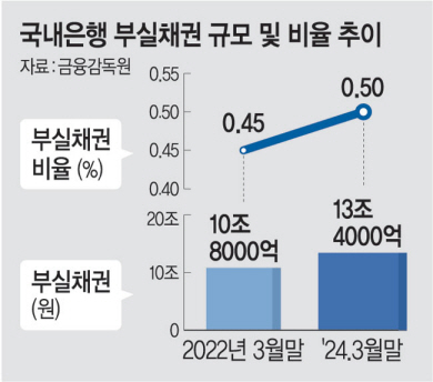 국내은행의 부실채권(고정이하여신) 규모가 13조 원을 넘어서며 3년 만에 최대 수준을 기록했다. 부실채권 비율도 2년여 만에 최고 수준으로 상승했는데, 고금리·고물가에 경기 부진이 길어지면서 은행에서 돈을 빌리고 제때 갚지 못하는 가계와 기업이 빠르게 늘어나고 있는 것으로 분석된다.