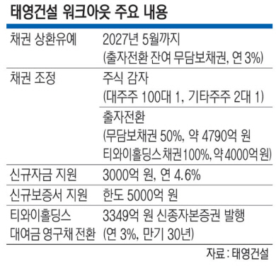 31일 금융권에 따르면 태영건설은 지난 30일 금융채권자협의회 주채권 은행은 KDB산업은행과 기업개선계획을 위한 이행약정(MOU)을 체결했다. 기업개선계획 이행은 이날(31일)부터다. 지난달 말 채권단은 제3차 금융채권자협의회를 열어 태영건설의 재무구조 개선안을 결의했고 태영건설이 이를 받아들인 것이다. 주요 내용은 △대주주 100대 1 등 주식 감자 △8790억 원 규모 출자전환 △출자전환 잔여 무담보채권 채권상환 유예 △신규 자금 및 보증서 대출 지원(최대 8000억 원) △티와이홀딩스 대여금 영구채 전환 등이다.