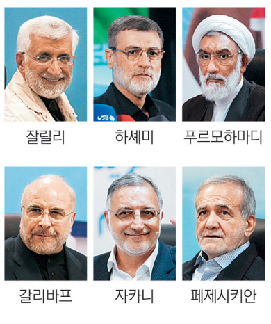 에브라힘 라이시 이란 대통령의 헬기 추락 사망 사고로 치러지는 이란 대통령 보궐선거 후보자가 6명으로 최종 확정됐다. 이 중 유력 후보로 거론되는 모하마드 바게르 갈리바프(63) 국회의장을 포함한 5명이 보수 성향, 1명이 진보 성향이어서 이번에도 사실상 보수 성향의 대통령이 선출될 것이라는 전망이 우세하다. 9일 이란 선거관리위원회는 오는 28일 열리게 될 보궐선거에 출마를 신청한 80명 중 6명이 헌법수호위원회의 자격 심사를 통과했다고 밝혔다. 출마 자격을 획득한 6명의 최종 후보는 갈리바프 의장, 사이드 잘릴리(59) 전 이란 핵협상 대표, 알리레자 자카니(58) 테헤란 시장, 모스타파 푸르모하마디(64) 전 법무장관, 아미르호세인 가지자데 하셰미(53) 부통령, 마수드 페제시키안(70) 의원이다. 이란 국영 IRNA통신은 이 중 페제시키안 의원만 진보 성향으로 분류했고, 나머지 5명의 후보는 모두 보수 성향으로 분석했다.