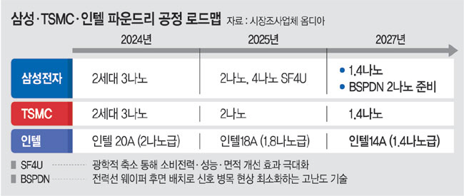 하지만 도전도 만만치 않다. 미국 정부로부터 막대한 보조금을 지원받은 인텔은 삼성전자와 TSMC보다 먼저 올 연말 2나노 도입을 선언한 상황이다. TSMC는 2026년부터 2나노 공정을 양산하고, 2026년 하반기에 1.6나노를 도입한다는 계획이다.