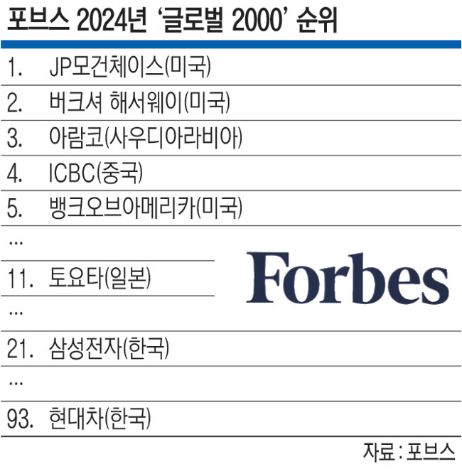 국내 기업 중에서는 삼성전자 외에도 현대차가 작년(104위)보다 11계단 뛰어오른 93위에 자리하며 100위권으로 진입했다. 2014년 87위를 차지한 이래 10년 만이다. 이와 함께 기아(234위)·KB금융(250위) 등이 300위 내에 포함됐다. 전체 순위로 보면 JP모건체이스가 2년 연속 1위에 올랐고, 2위는 버크셔 해서웨이(이상 미국), 3위는 사우디아라비아의 아람코, 4위는 중국공산은행(ICBC)이 차지했다. 중국을 제외한 아시아 기업으로는 일본의 토요타가 11위로 가장 높았다. 포브스는 “시가총액 3조 달러(약 4141조 원)에 달하는 칩 제조업체인 엔비디아가 100계단 이상 상승한 110위에 오르고, 데이터센터용 서버를 판매하는 새너제이의 슈퍼마이크로컴퓨터가 856위로 데뷔하는 등 AI의 영향력이 커지고 있음을 알 수 있다”고 말했다.