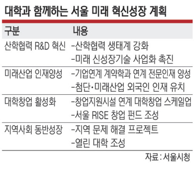 대학창업 활성화를 위해 오는 2029년까지 서울캠퍼스타운에서 1300개 이상의 대학창업기업을 배출하고 자금투자, 기술 실증, 해외 진출 등 단계적 창업지원 사다리를 연결해 ‘유니콘기업’으로의 성장을 도울 계획이다. 서울캠퍼스타운은 대학과 지역 협력을 통한 창업보육 프로그램 등을 운영하는 사업이다.