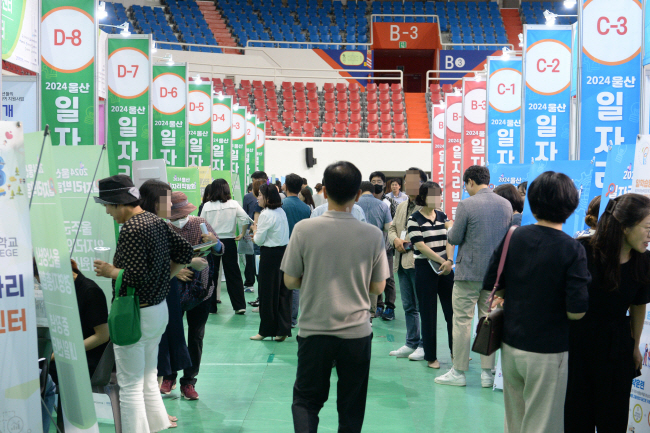 19일 울산 중구 동천체육관에서 열린 ‘2024 울산 일자리 박람회’에서 취업을 희망하는 관람객들이 전시 부스를 살펴보고 있다.