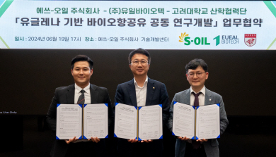 에쓰오일은 서울 강서구 에쓰오일 기술개발(TS&D)센터에서 미생물 생산 기술 보유 스타트업인 유일바이오텍 및 고려대와 함께 ‘유글레나 기반 바이오 항공유 연구·개발(R&D)’ 업무협약(사진)을 체결했다고 밝혔다. 국내 바이오 항공유 산업의 해외 의존도를 낮추고 자체 생산능력을 확충하기 위해 성과를 공유할 예정이다.