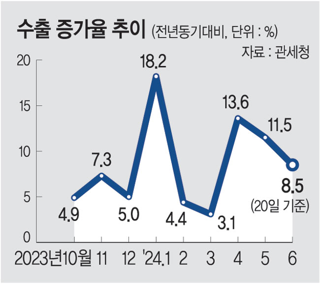 21일 관세청에 따르면 6월 1∼20일 수출액(통관기준잠정치)은 357억5100만 달러(약 49조7000억 원)로 1년 전보다 8.5% 증가했다. 조업일수를 고려한 일평균 수출액도 8.5% 늘었다. 이 기간 조업일수는 14.5일로 지난해와 같았다. 수출액은 월간 기준으로 지난해 10월부터 지난달까지 8개월째 증가세가 계속됐고 이달에도 플러스를 기록할 가능성이 크다.
