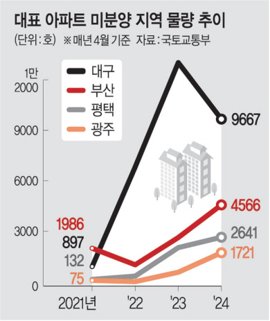 문제는 매수 심리가 살아나고 있는 서울과 일부 수도권 부동산 시장과 달리 지방 부동산 시장이 반등의 기미를 보이지 않고 있다는 점이다. 지난 4월 기준 전국 미분양 아파트(7만1997가구) 중 서울은 900여 건에 불과했지만, 대구·경북 등은 9000건을 웃돌았다. 준공 후에도 미분양이 해소되지 않는 악성 물량은 전국에 1만2968건인데 부산·대구만 모두 1000건이 넘어섰다.