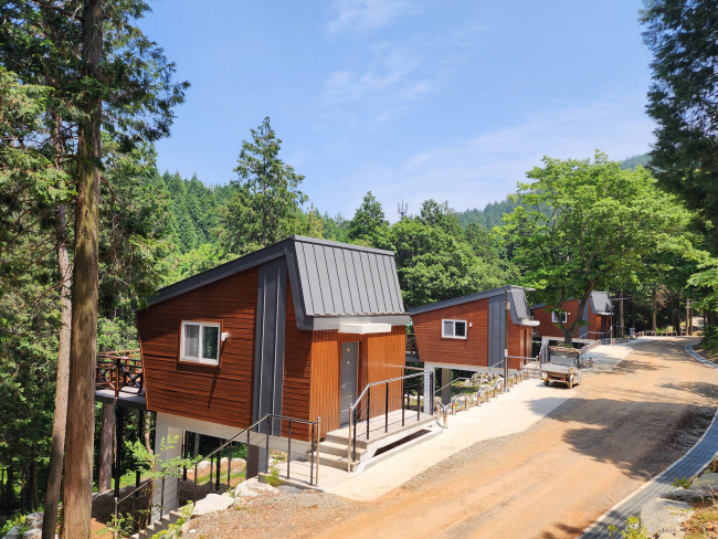 28일 고성군에 따르면 갈모봉숲길 42에 조성된 고성 갈모봉 자연휴양림(사진)은 피톤치드가 대량으로 뿜어져 나오는 수령 50년 이상의 편백 우량림이다. 휴양림에 신축된 숙박시설 ‘숲이 그린 집’은 지난 17일부터 예약을 받기 시작했다. 현재 신축 공사에 따른 소음 등 이용자 편의를 고려해 설치 완료된 7동 중 4인실 3동만 운영 중이다.