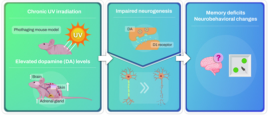 공동연구팀은 생쥐 피부에 6주간, 총 18회 자외선을 쪼인 후 뇌의 기억 형성, 신경 발생 및 시냅스 가소성(신경세포 접합부의 전달 효율이나 결합 양상의 지속적인 변화)을 측정했다. 실험 결과, 장기적인 자외선 노출은 신경생리학적으로 신경 발생과 시냅스 가소성을 악화시키는 것으로 나타났다. 연구팀은 도파민 뉴런 분화에 영향을 주는 유전자 발현을 변화시켜 피부에 닿는 자외선이 기억력 저하를 유발한다는 사실을 입증했다. 자외선에 노출된 생쥐는 새로운 물체와 위치를 인식하는 데 어려움을 겪었다. 미로에 둬 기억 능력을 평가했을 때에도 공간 및 작업 기억 능력이 유의하게 감소되는 것으로 나타났다. 피부에 닿는 만성적인 자외선 노출이 중추 신경계와 피부를 포함한 말초 기관의 도파민 수준을 변화시켜 해마 기억 상실과 신경 발생 장애와 같은 신경 행동에 변화를 일으킨 것이다.