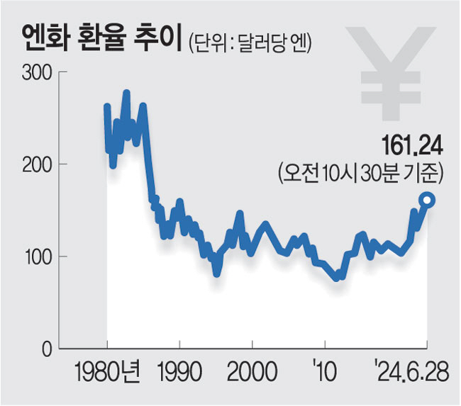 엔·달러 환율이 161엔도 돌파해 엔화 환율이 어디까지 오를지 관심이 쏠리고 있다. 원화 환율에도 영향을 줄 것으로 예상된다. 시장은 미국과 일본의 금리 차이가 장기화하면서 엔·달러 환율이 170엔을 넘을 가능성이 있다고 전망한다. 일본 외환 당국의 시장 개입 가능성으로 미 국채 금리가 오르는 등 글로벌 금융시장이 엔화 흐름에 주목하고 있다.