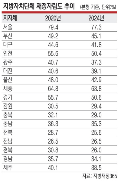 정부가 지난달 발표한 올해 5월 말 기준 국세 수입은 151조 원으로 전년 동월 160조2000억 원보다 약 9조2000억 원 적게 걷힌 것으로 집계됐다. 특히 지방교부세 재원인 내국세도 같은 기간 8조9000억 원 감소한 것으로 나타났다. 지금과 같은 지방재정 압박 상황이 지속될 가능성이 크다는 의미다. 각 지자체의 재정자립도는 갈수록 악화하고 있다. ‘지방재정365’에 공개된 광주시(본청) 재정자립도는 2020년 40.7%에서 올해 37.3%로 떨어졌다. 같은 기간 부산시 49.2%→45.1%, 제주도 40.1%→38.5%, 전북도 28.7%→25.6%를 기록했다. 손종필 나라살림연구소 수석연구위원은 “낭비성 예산과 불용액·이월액 규모를 줄여 한정된 재원을 효율적으로 편성하는 전략이 필요하다”고 말했다.