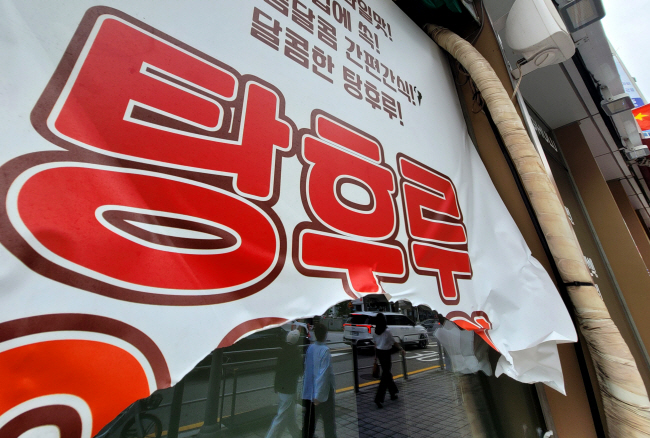 중국에서 건너온 탕후루의 인기가 사그라지고 있는 가운데 11일 서울 시내 폐업한 한 탕후루 가게에 내걸렸던 홍보물이 찢겨 있다. 행정안전부에 따르면 지난 4월부터 하루 평균 1곳 이상의 탕후루 상점이 폐업 신고를 하고 있다.