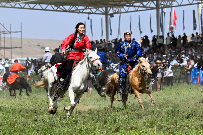 몽골 혁명 기념일을 축하하기 위해 14일 내몽골 자치구에서 열린 ‘나담 축제’에서 말 달리기 행사가 진행되고 있다.