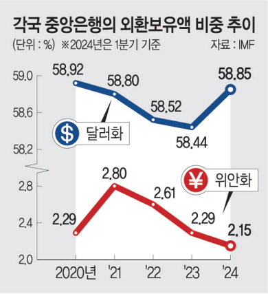 달러 영향력이 하락할 것이란 예상과 반대의 상황이 2020년 이후 벌어지고 있는 것이다. 같은 기간 유로화 비중은 2020년 21.29%에서 올해 1분기 19.69%로 주요 통화 중 가장 뚜렷하게 감소했다.