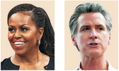 조 바이든 미국 대통령이 민주당 대선 후보 자리에서 물러날 경우 가장 유력한 대체 후보로는 카멀라 해리스 부통령이 거론된다. 도널드 트럼프 전 대통령에 맞서 어느 정도 경쟁력을 보여준 데다 바이든 대통령이 모금한 후원금을 활용하는 데에 법적 장애물도 없기 때문이다. 일각에서는 대중적 인기가 상당한, 버락 오바마 전 대통령의 부인인 미셸 오바마(왼쪽 사진) 여사의 ‘깜짝 등판’을 거론하기도 한다. 개빈 뉴섬(오른쪽) 캘리포니아 주지사, 그레천 휘트머 미시간 주지사, 조시 셔피로 펜실베이니아 주지사 등도 대체 후보군으로 꼽힌다.