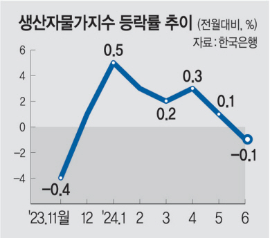 23일 한국은행에 따르면 6월 생산자물가지수는 119.19(2020년=100)로, 전월보다 0.1% 낮아졌다. 지난해 11월 이후 7개월 만에 오름세가 꺾였다. 농림수산품 가격이 지난달보다 2.8% 하락하며 생산자물가 하락을 주도했다. 농림수산품은 지난 4월부터 석 달 연속 내림세를 나타내고 있다. 축산물은 2.5% 올랐지만, 농산물과 수산물이 각각 -6.6%, -0.8% 떨어졌다. 특히 배추(-45.3%)와 참외(-28.1%), 고등어(-39.7%), 게(-12.7%) 등의 가격이 크게 내렸다.