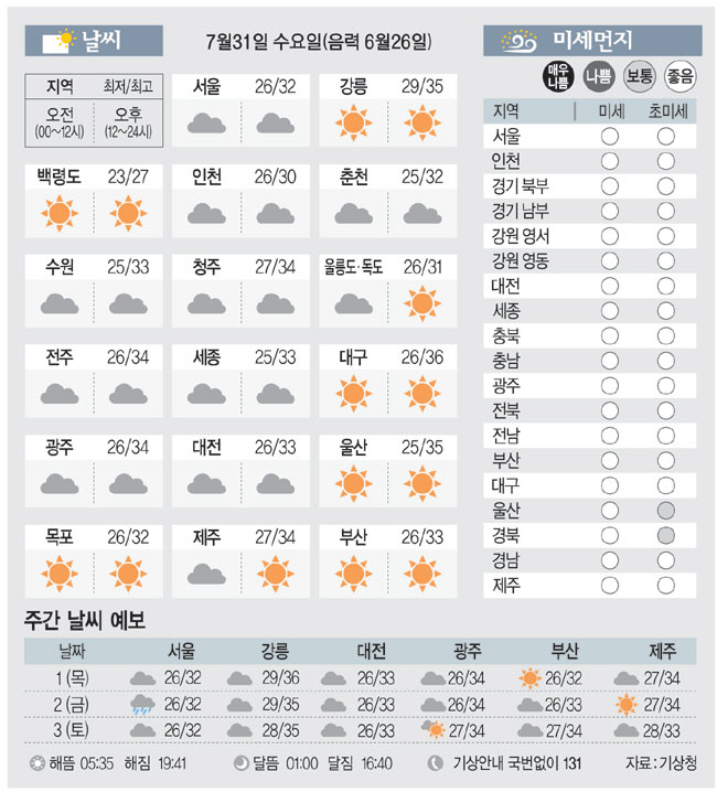 [날씨이야기] 7월31일 수요일(음력 6월26일)