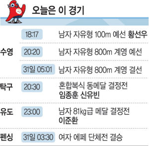 유도 남자 81㎏급 이준환(용인대), 여자 63㎏급 김지수(경북체육회)는 30일 오후 5시 샹드마르스 아레나 매트에 오른다. 메달 결정전은 오후 11시로 예정돼 있다. 이원호(KB국민은행)와 오예진(IBK기업은행)은 이날 오후 4시 30분 샤토루 슈팅센터에서 사격 공기권총 10m 혼성전 동메달을 놓고 인도의 마누 바커-사랍조트 싱과 겨룬다.