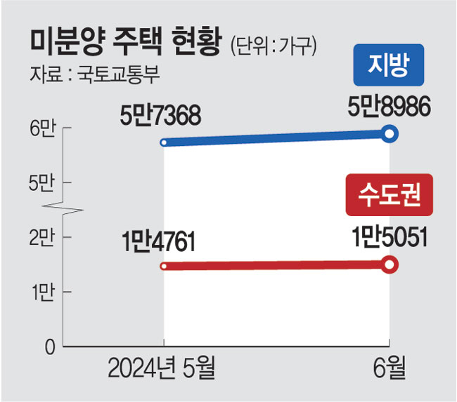 ‘악성 미분양’으로 불리는 준공 후 미분양 주택은 지난달 1만4856가구로 전월보다 12.3%(1626가구) 증가했다. 11개월 연속 증가세다. 악성 미분양 주택 규모는 2020년 10월(1만6084가구) 이후 3년 8개월 만에 가장 크다. 대부분의 악성 미분양은 수도권을 제외한 지방에 몰려 있다. 서울 집값이 들썩이는 가운데 지난달 서울 아파트 거래량은 부동산값 상승기이던 2020년 12월(8764건) 이후 3년 6개월 만에 가장 많았다. 6월 서울 아파트 거래(신고일 기준)는 6150건으로 전월보다 18.7%, 지난해 같은 기간보다는 48.7% 증가했다.