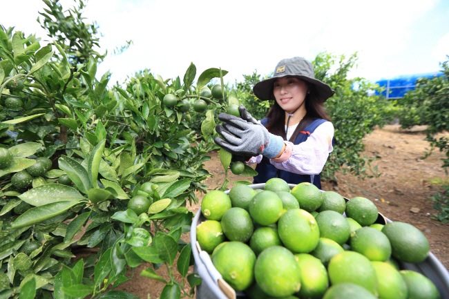 1일 제주특별자치도 서귀포시 농촌진흥청 국립원예특작과학원 감귤연구센터 시험 재배지에서 한 연구원이 ‘풋귤’을 수확하고 있다.