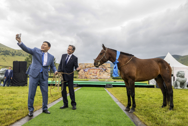 1일 롭상남스라이 어용에르덴(왼쪽) 몽골 총리가 울란바토르 인근에서 토니 블링컨 미국 국무장관에게 말을 선물한 후 함께 셀카를 찍고 있다.