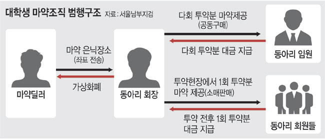 검찰에 따르면 지난 2021년 동아리를 결성한 A 씨는 대학생들이 주로 사용하는 SNS를 이용, 고가의 외제차와 고급 호텔·식당 등을 무료 또는 저렴하게 이용할 수 있다며 약 300명의 회원을 모집했다. 대학생 연합동아리 중 전국 2위에 해당하는 규모다. A 씨는 참여율이 높은 회원들을 호텔이나 뮤직 페스티벌 등에 초대해 술을 마시다가 경계심이 흐트러진 틈을 타 마약을 권한 것으로 나타났다. 액상 대마로 시작한 마약 투약은 LSD·필로폰 등 중독성과 부작용이 심각한 마약으로 이어졌다. A 씨는 동아리 남성 회원들과 유흥업소 여종업원들을 호텔에 초대해 집단으로 마약을 투약하게 하기도 했다. 가상화폐 세탁업자를 통해 텔레그램 마약 딜러에게 가상화폐를 보내고 마약 은닉 장소를 전달받는 ‘던지기’ 수법으로 마약을 구한 A 씨는 회원들에게 한 번씩 투약할 분량을 팔면서 단가를 더 높게 책정해 차액을 챙겼다. 지난해 마약대금으로 활용된 가상화폐는 1200만 원이 넘는 것으로 조사됐다.