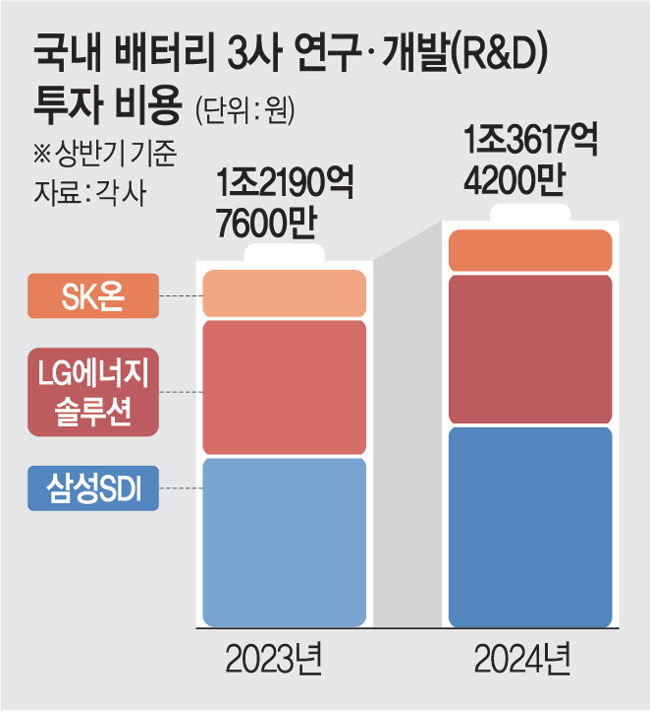 업계는 이 외에도 전해질(배터리 셀 내에서 양극과 음극 사이에 위치해 이온을 전달하는 물질)을 휘발성 액체가 아닌 안정된 고체로 바꿔 화재·폭발 가능성을 낮춘 ‘전고체 배터리’ 개발 등에도 속도를 내고 있다. 각 사 반기 보고서에 따르면 배터리 3사의 연구·개발(R&D) 투자 비용 총합은 올해 상반기(1∼6월) 1조3617억4200만 원으로 전년 동기(1조2190억7600만 원) 대비 1426억6600만 원 증가했다.