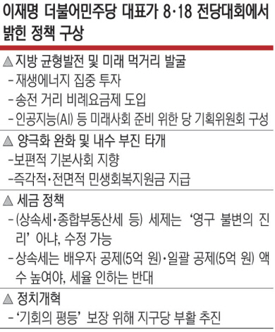 박성민 정치컨설팅 민 대표는 “180석이나 안겨줬는데 제대로 한 게 없다고 아쉬워한 강성 지지층과 달리 중도층은 ‘검수완박(검찰 수사권 완전 박탈)을 비롯해 왜 일방적으로 밀어붙이기만 하느냐’며 지지를 철회한 결과가 0.73%포인트 차이로 갈린 2022년 대선”이라고 지적했다. 이 대표가 상속세와 종합부동산세 등 세제와 관련해 연일 유연한 입장을 내놓은 것 역시 외연 확장을 위한 행보라는 분석이 나온다.