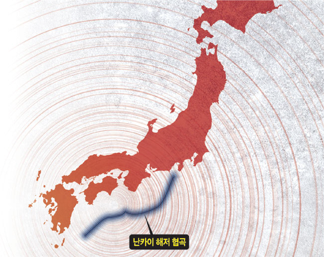 ◇한 세기에 한 번꼴로 오는 규모 8∼9의 대지진… 일본 수도권 서쪽까지 영향권 = 일본이 가장 두려워하고 경계하는 난카이 대지진은 수도권 서쪽인 시즈오카(靜岡)현 앞바다에서 시코쿠(四國) 남부, 규슈 동부 해역까지 이어진 난카이 해곡에서 100∼150년 간격으로 발생한다는 지진이다. 필리핀 해판과 아무르판 사이 판 경계의 섭입 지대인 난카이 해곡은 깊이 4000m 해저에 위치해 있다. 이 난카이 해곡을 따라 일어난 대지진은 1944년 도난카이(東南海) 지진(규모 7.9)과 2년 뒤인 1946년 쇼와난카이(昭和南海) 지진(규모 8.0)이 마지막이다. 쇼와난카이 지진 당시 6.9m 높이의 쓰나미가 발생한 것으로도 알려졌다. 마지막 난카이 대지진이 일어난 지 78년이 지난 만큼, 일본 정부는 난카이 대지진이 30년 이내에 발생할 확률을 70∼80%로 보고 있다.