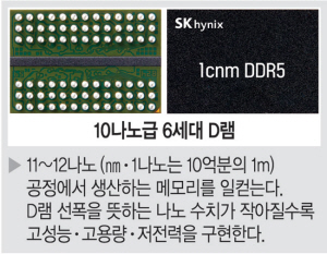 SK하이닉스가 현존하는 D램 중 가장 미세화된 ‘10나노(㎚·1나노는 10억 분의 1m)급 6세대(1c)’ 기술을 세계 최초로 개발했다고 29일 밝혔다. 메모리 선폭을 의미하는 나노 수치가 작아질수록 처리 속도는 빨라지고, 소비전력은 줄어든다. 11∼12나노인 6세대는 기존 12∼13나노인 5세대 메모리보다 속도는 11% 빠르고, 전력효율은 9% 이상 개선된다. 5세대 기술은 지난해 5월 삼성전자가 SK하이닉스보다 열흘 먼저 양산에 성공한 바 있어, 차세대 D램을 두고 K-메모리 경쟁이 극한 경쟁으로 이어질 전망이다.