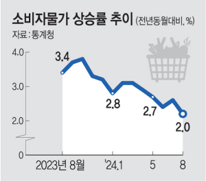 8월 소비자물가 상승률이 2%를 기록하며 3년 5개월 만에 최저치로 떨어졌다. 국제유가 하락으로 석유류 물가 상승 폭이 줄었고 농산물 물가가 안정세를 보였기 때문이다. 다만 추석을 앞둔 가운데 배·사과 등 일부 과일 물가는 여전히 높은 수준을 유지했다.