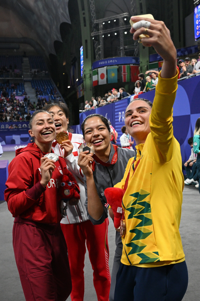 8월 30일 프랑스 파리 그랑팔레에서 열린 2024 파리 패럴림픽 장애인 태권도 여자-57㎏급 공동취재구역에서 은메달 감제 구르달(튀르키예·왼쪽부터), 금메달 리위제(중국), 동메달 팔레샤 고베르단(네팔), 실바나 페르난데스(브라질) 선수가 갤럭시 Z 플립6 올림픽 에디션으로 ‘빅토리 셀피’를 찍고 있다.