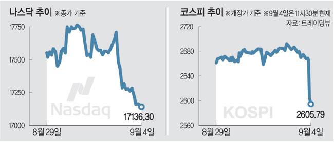 4일 국내 증시가 휘청이는 것은 미국에서 향후 경기 전망을 부정적으로 보는 경제지표가 공개된 영향 탓이다. 특히 올해 글로벌 증시 상승을 주도했던 엔비디아 주가가 간밤 9%가 넘게 하락하며 관련 여파가 국내 증시로 옮겨붙었다. 코스피 시가총액 상위 종목들이 약세를 보이는 가운데 삼성전자·SK하이닉스 등 반도체 종목의 하락이 두드러졌다. 전문가들은 통상 9월이 미국 증시가 수익률이 낮은 달로 여겨지는 데다 오는 11월 미국 대선 등 큰 이벤트를 앞둔 만큼 당분간 변동성이 큰 장이 이어질 것이라는 전망을 하고 있다.