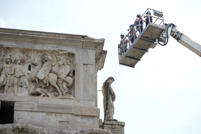 4일 이탈리아 로마에서 크레인에 탑승한 인부들이 전날 번개에 맞아 일부 손상된 콘스탄티누스 개선문 윗부분을 살펴보고 있다.