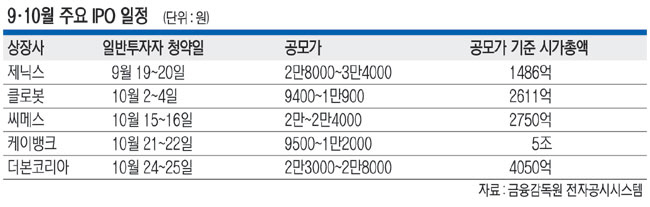 20일 금융감독원 전자공시에 따르면 물류 기업 ‘제닉스’는 이날까지 일반투자자 대상 청약을 마무리한다. 제닉스는 이번 공모를 통해 264억 원을 모집하는데, 앞선 기관 대상 수요 예측 결과 1051 대 1의 경쟁률을 기록하는 등 기대를 받기도 했다. 10월부터는 16개 기업이 줄줄이 일반투자자 대상 공모주 청약을 실시한다. 공모주 일반청약 일정이 몰리는 ‘공모주 슈퍼위크’는 10월 둘째 주(7∼11일)와 셋째 주(21∼25일)로 각각 6곳씩 청약에 나선다. 청약 일정 순으로는 △토모큐브 △셀비온 △한켐 △인스피언 △루미르 △와이제이링크 △쓰리빌리언 △씨메스 △클로봇 △웨이비스 △닷밀 △탑런토탈솔루션 △성우 △케이뱅크 △노머스 △더본코리아 등이다. 이 가운데 가장 주목받는 종목은 카카오뱅크에 이어 인터넷전문은행 중 두 번째 상장에 나서는 케이뱅크다. 시가총액은 최대 5조 원, 공모금액은 9840억 원에 달해 올해 상장하는 기업 가운데 규모가 가장 크다. 시가총액은 4000억 원 수준이지만 백 대표가 운영하는 더본코리아도 주목을 끌고 있다. 더본코리아는 백 대표의 지식재산권(IP)을 기반으로 다수의 프랜차이즈 브랜드를 운영 중이다.