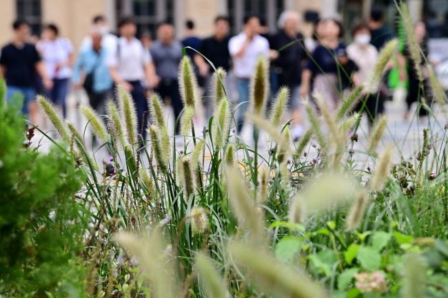 19일 남부 지방을 중심으로 많은 비가 내려 선선한 가을 날씨가 찾아온 20일 오전 서울 중구 세종대로에서 시민들이 ‘가을의 전령’으로 불리는 수크령이 핀 길을 걸으며 가을 정취를 만끽하고 있다.
