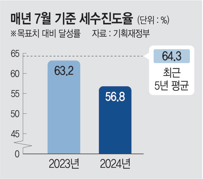 20일 관계부처와 세정 당국에 따르면 기획재정부는 올해 세수 부족분이 32조 원에 달할 것으로 보고 세수 재추계의 마무리 작업을 하고 있는 것으로 알려졌다. 올해 들어 지난 7월까지 국세수입(208조8000억 원)은 1년 전보다 8조8000억 원 부족한 상황이다. 연간 국세수입 예산(367조3000억 원)이 지난해 실적보다 23조2000억 원 많은 규모로 잡혔지만 실제로는 9조 원가량이 덜 걷힌 셈이다. 이 추세라면 올해는 32조 원의 세수가 부족하게 되고 총 335조3000억 원의 세수가 확보될 것으로 예측된다.