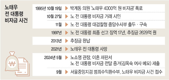 24일 문화일보 취재를 종합하면 서울중앙지검 범죄수익환수부(부장 유민종)가 이른바 ‘선경 300억’ 메모와 관련한 비자금 의혹에 대해 수사 착수 여부를 검토 중인 가운데, 사법당국 고위 관계자들도 수사 가능성을 내비쳤다. 지난 5일 박성재 법무부 장관은 국회 예산결산특별위원회에서 해당 메모에 대해 “세금포탈이 확인되면 형사적으로 처벌할 수 있다”며 “조만간 법무부 입장을 밝히겠다”고 했다. 심우정 검찰총장도 지난 3일 인사청문회에서 노 전 대통령의 비자금 재수사와 관련해 “총장으로 선임된다면 법률적 검토에 나서겠다”고 답한 바 있다.