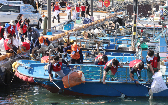 23일 오후 부산 영도구 하리항에서 부산해경, 롯데월드부산, SK에너지 등 기관·기업 직원들이 ‘제24회 국제연안정화의 날’을 기념해 해양환경 보전 활동 일환으로 해양 쓰레기를 수거하고 있다.