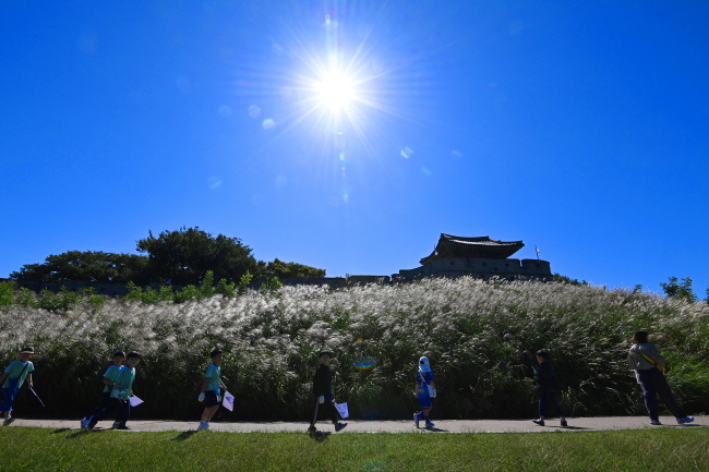 화창한 가을 날씨를 보인 23일 경기 수원시 팔달구 화서공원을 찾은 어린이들이 은빛 물결이 출렁이는 억새길을 거닐고 있다.